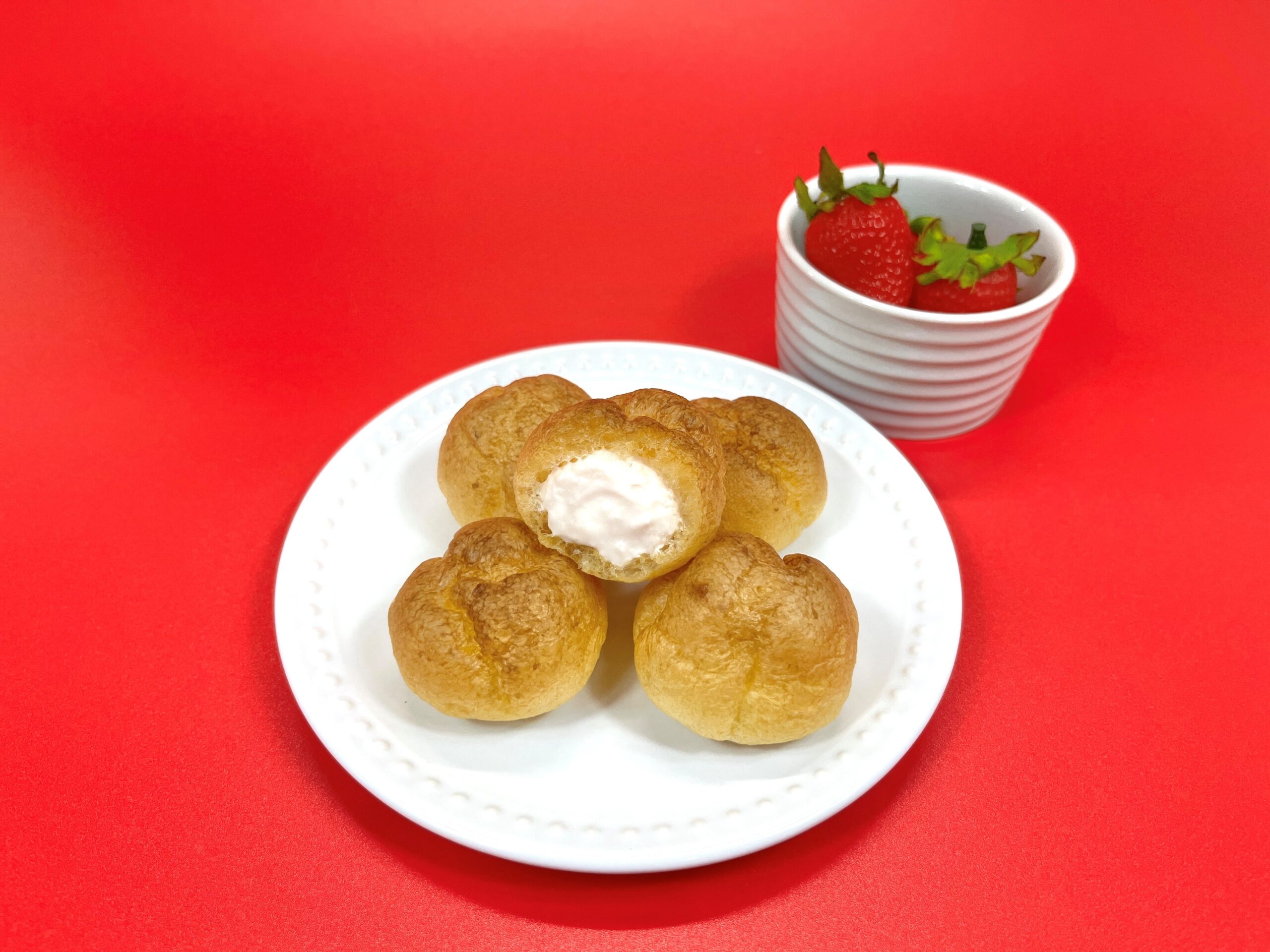 あまおう苺の美味しさをたっぷり味わえる、期間限定のプチシューです。ホイップクリームに自家炊きカスタードと甘酸っぱい苺ソースをブレンドしたクリームを、香ばしく焼き上げたかわいいプチシューに詰めました。食べやすい5コ入りのプチシューです。