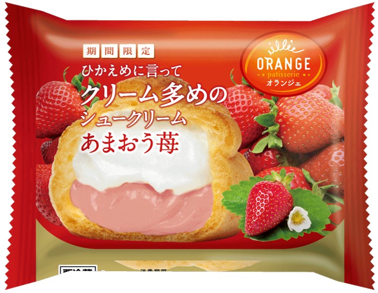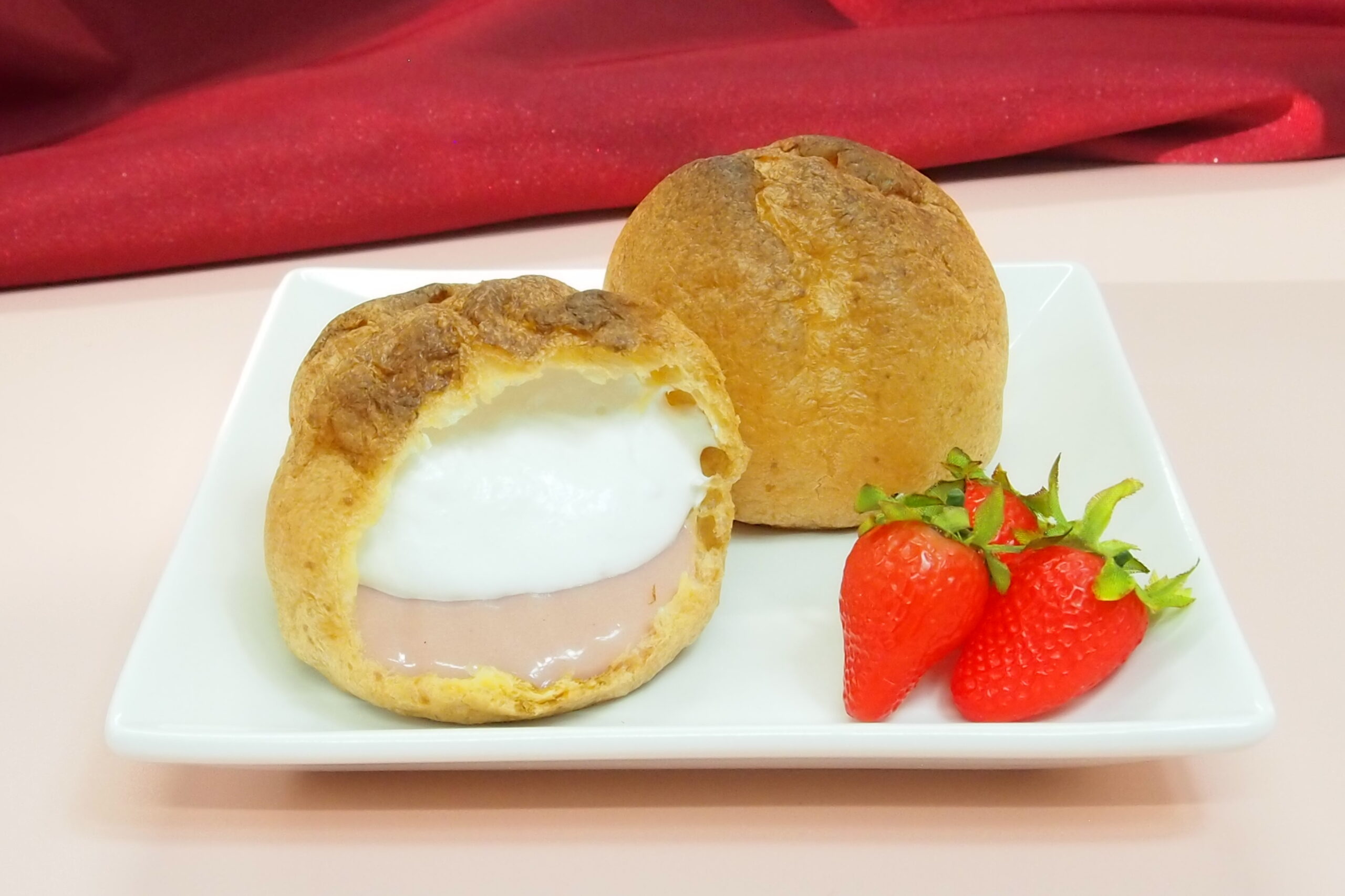 こんがり焼き上げた香ばしいパフに、なめらかなミルククリームとあまおう苺風味のクリームをたっぷり詰めました。