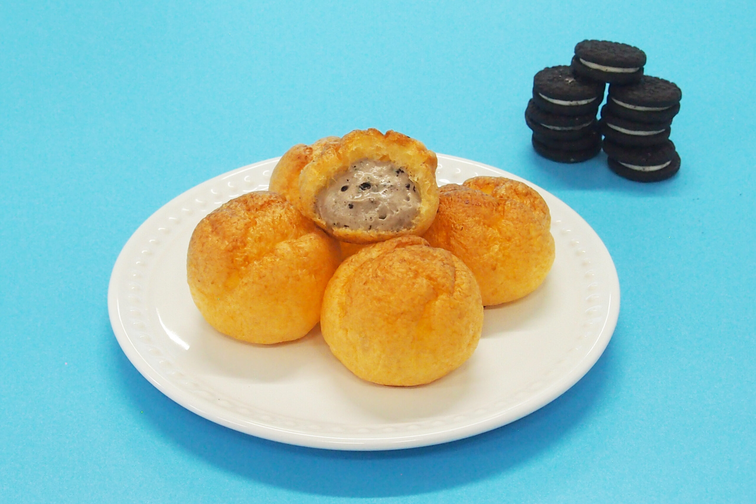 ココアクッキー風味のクリームを、こんがりと焼き上げたプチシューパフに詰めました。