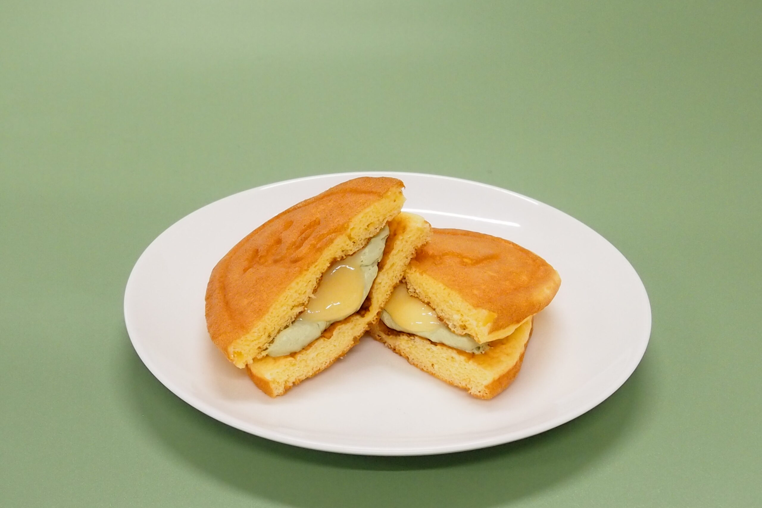 自家製カスタードを使用した抹茶クリームとれん乳ソースをもちもち生地で挟みました。